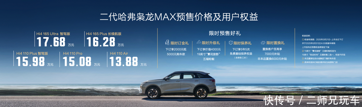 为回馈广大用户对哈弗的支持,二代哈弗枭龙MAX还推出了四重限时预售好礼。包括限时订金礼:下订享2000元抵5000元购车款;限时升级礼:下订享价值4000元19英寸“繁花旋影”五辐轮毂;限时保养礼:下订享5年5次免费基础保养权益(含首保/工时);限时置换礼:置换客户享本品置换7000元补贴,非本品置换6000元补贴。二代哈弗枭龙MAX以极具诚意的价格,让电混四驱触手可及。